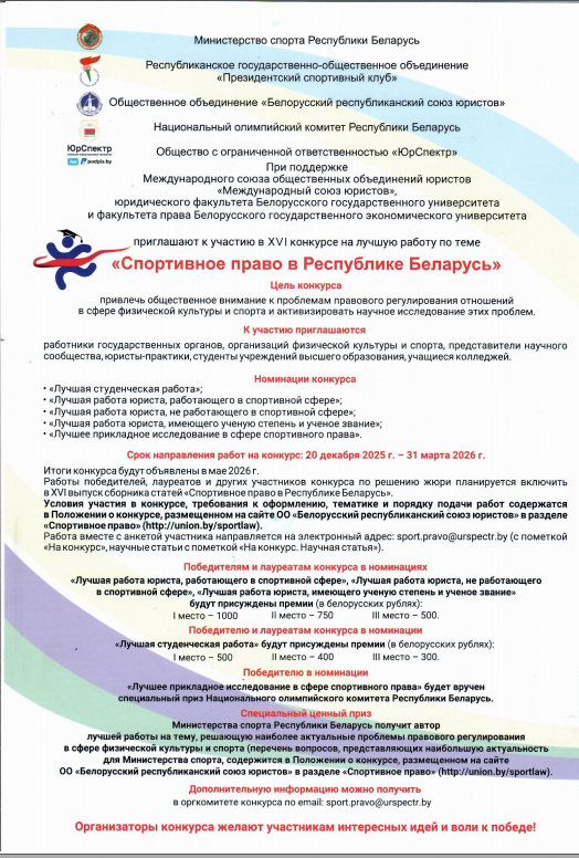 XVI конкурс на лучшую работу по теме "Спортивное право в Республике Беларусь"